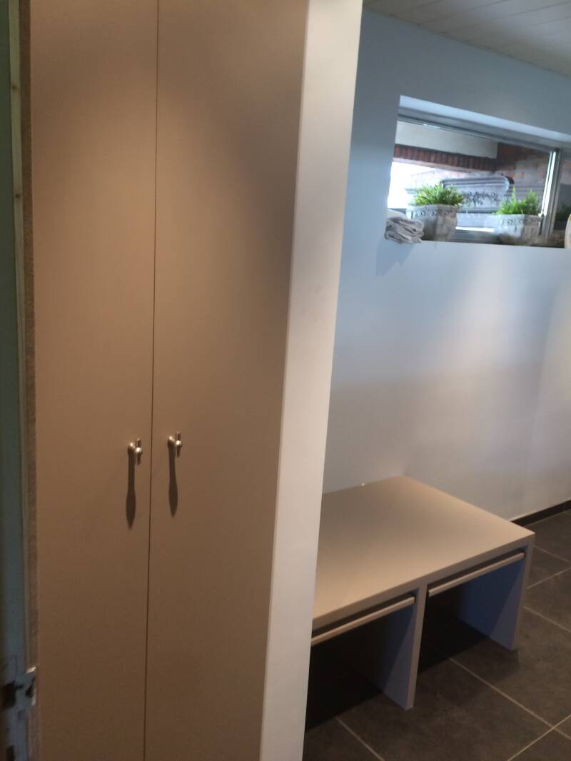 - Vestiairekast met onderaan 2 dempende en zelfsluitende schuiven.