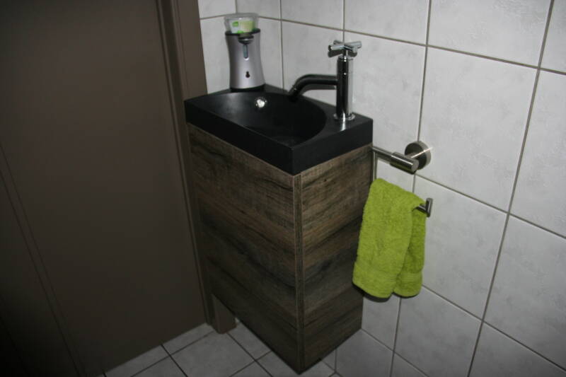 - Vervangen van een bestaand los wasbakje door een zwart opbouwbakje met handig opbergkastje er onder.