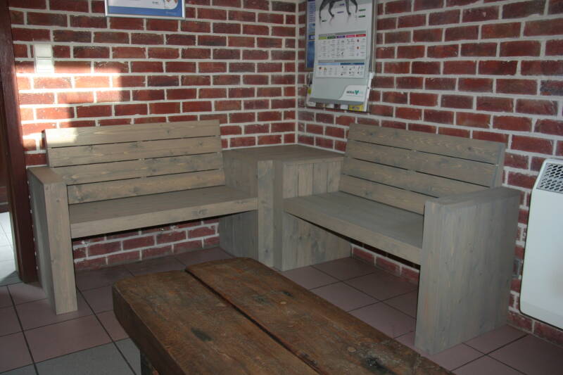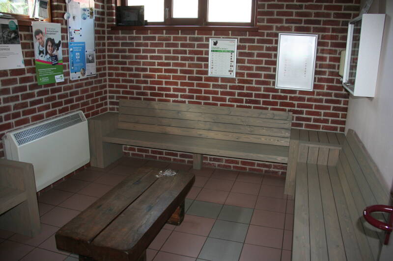 - Massieve houten banken in een wachtzaal van een dierenartsen-praktijk.