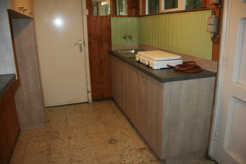 - Keuken van een voetbalkantine met voorraadberging en ballenkast met vlechtwerkdeur.