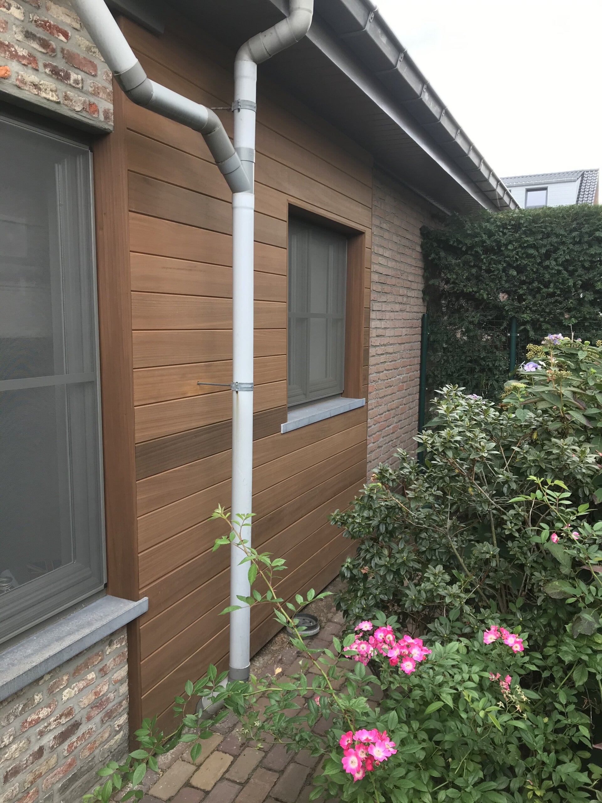 - Gevelbekleding in "Thermo Ayous" op gedrenkt lattenwerk.