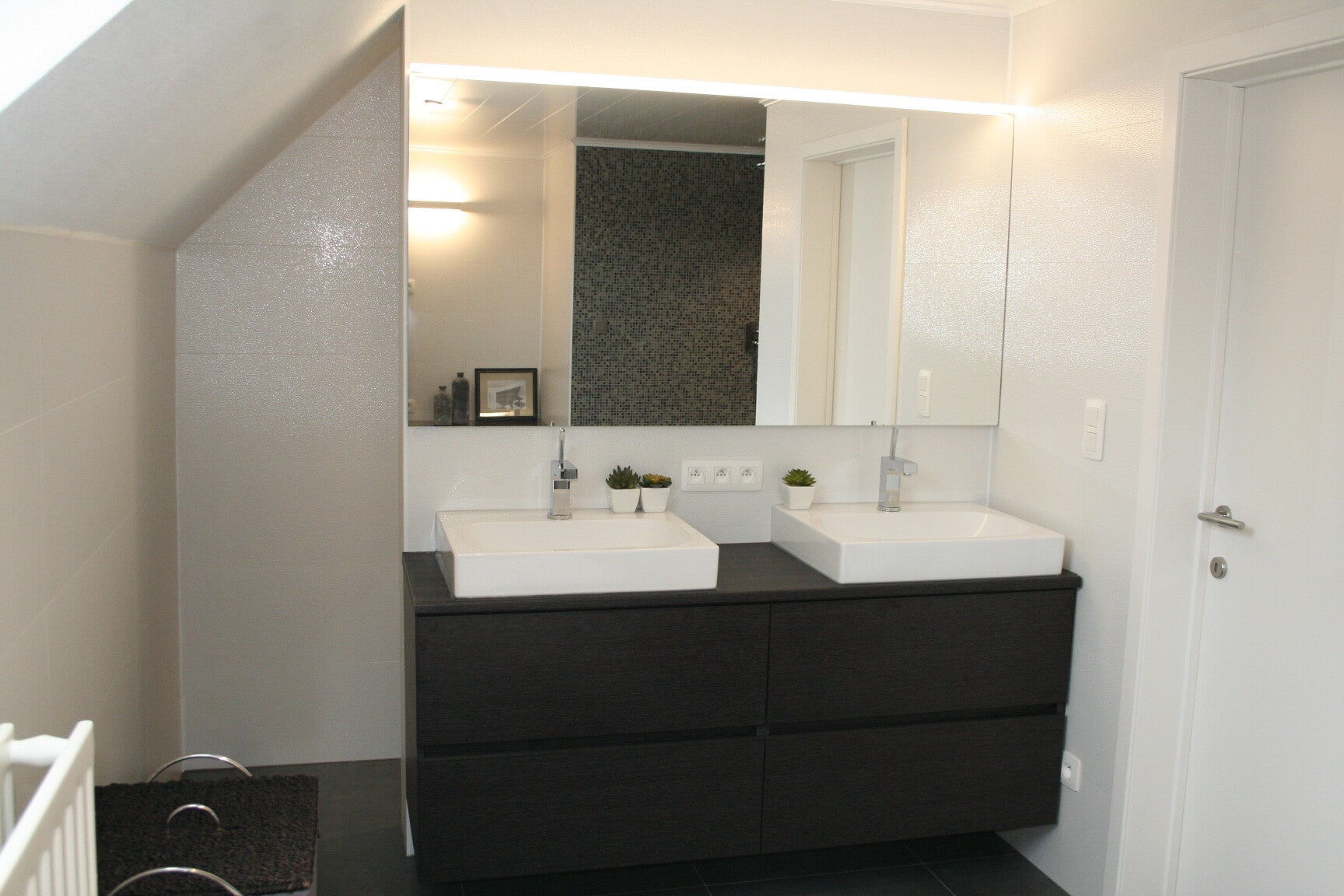 - De bovenkast lijkt enkel een spiegel, maar deze is volledig in de muur ingewerkt.