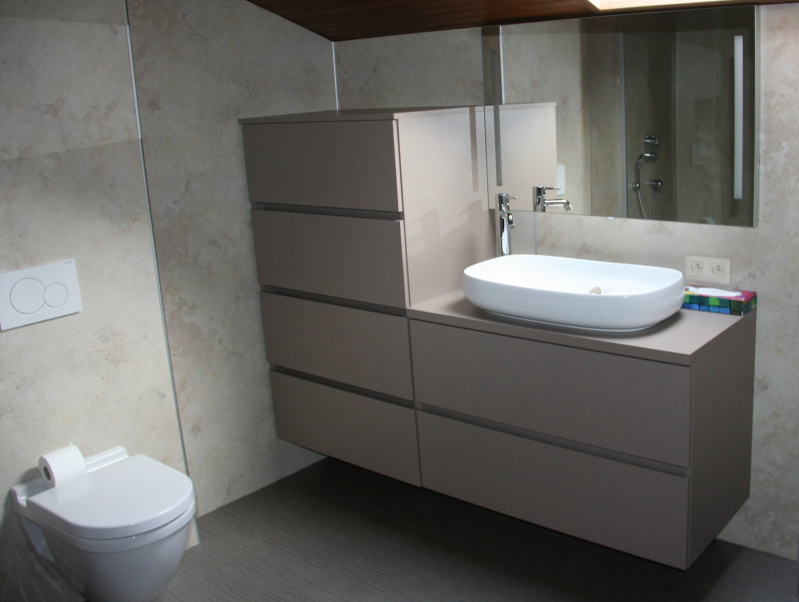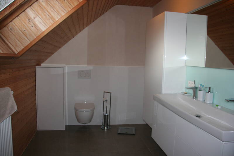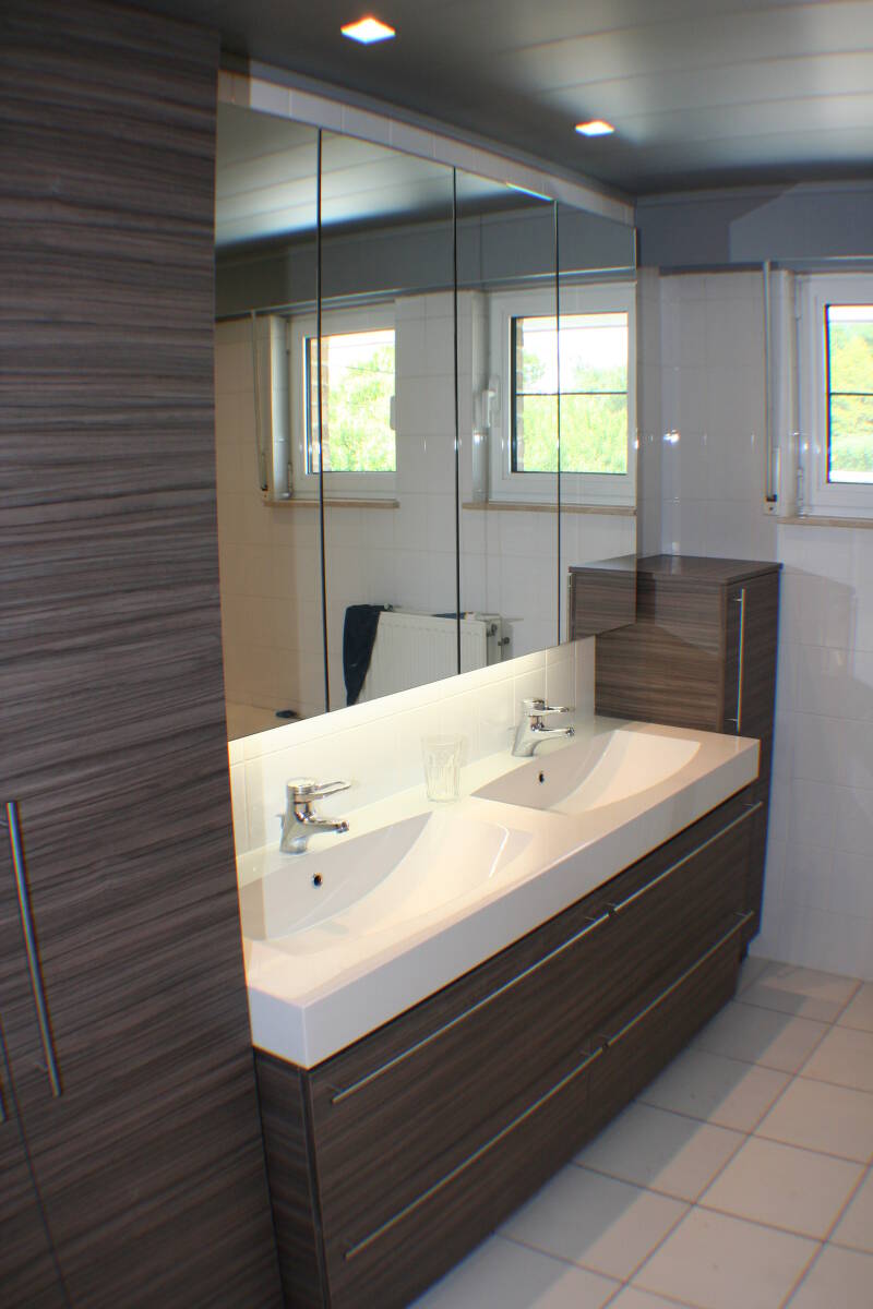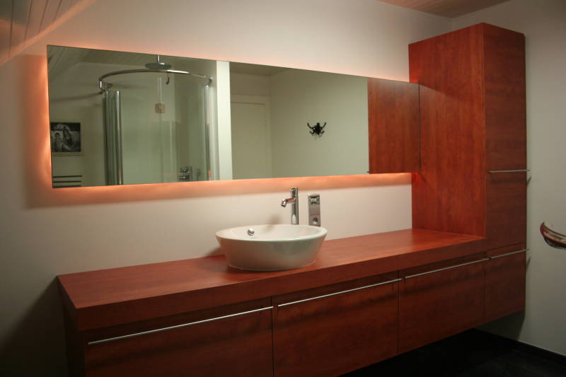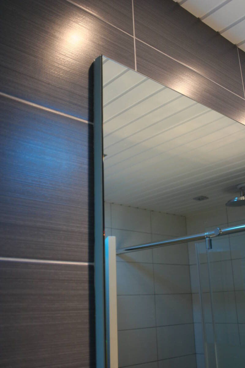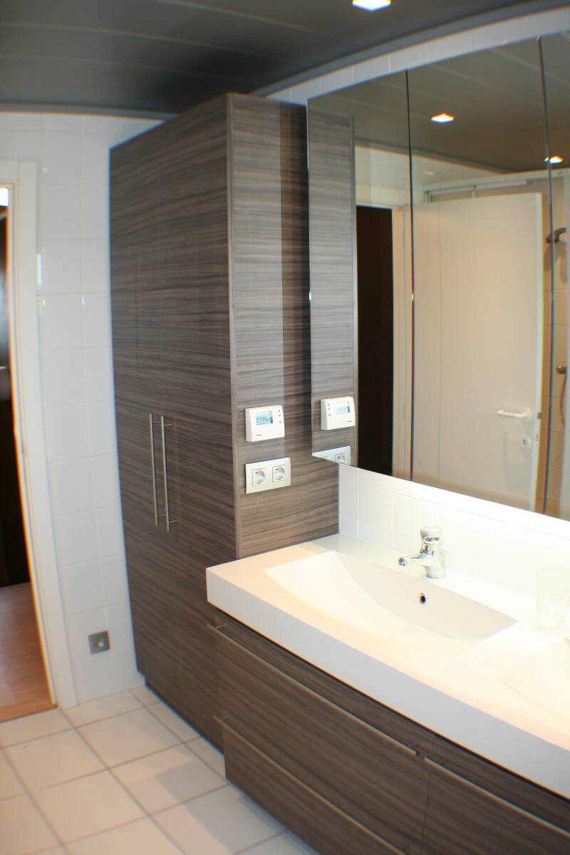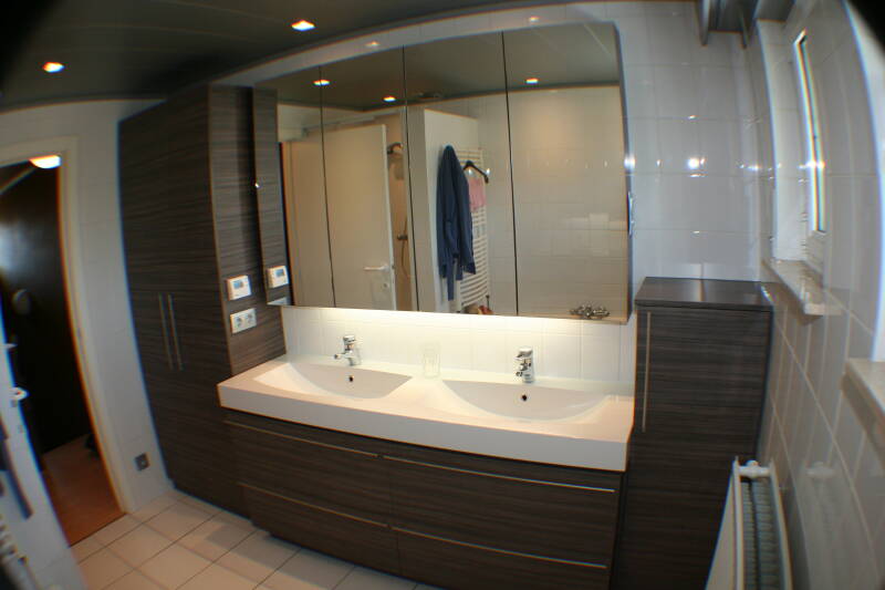 - De spiegelkast is gedeeltelijk in de voorzetwand ingewerkt.