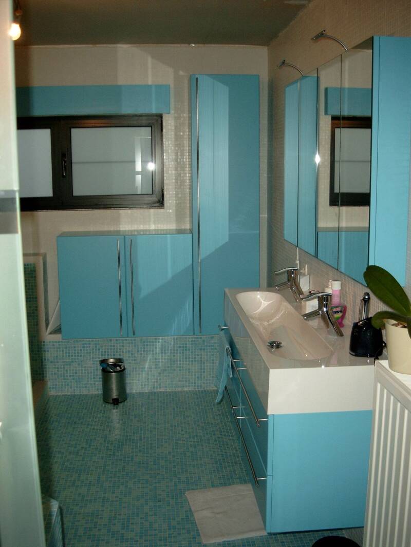 - Deze badkamer werd ontworpen en uitgevoerd in lakwerk met een kleur die volledig terugkwam in de kleur van de mozaïektegeltjes.