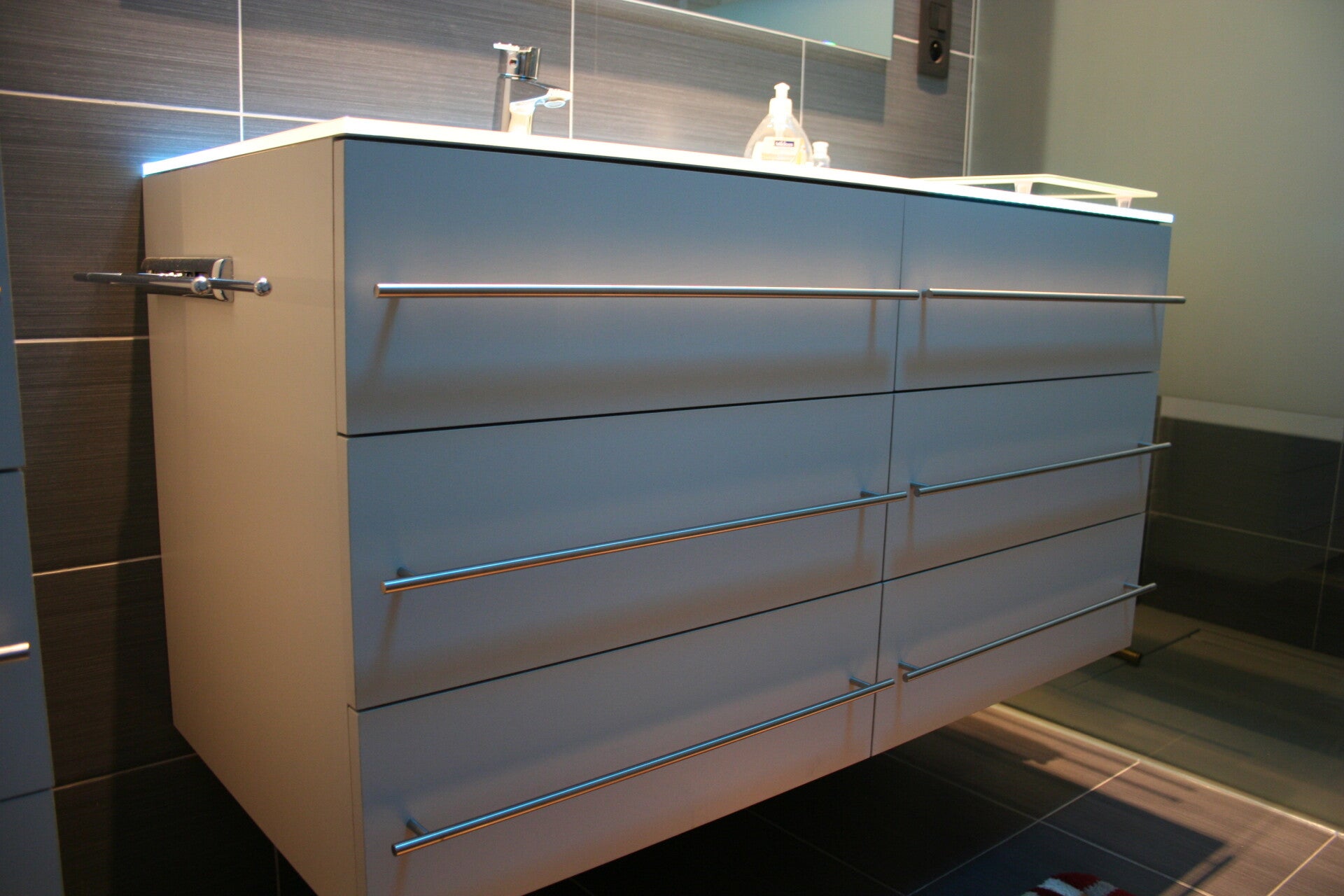 - 1 badmeubel met 6 schuiven en aan 2 zijden een uittrekbare handdoekdroger .