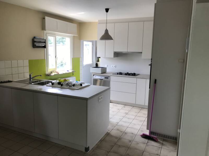 - Voor de aanvang van de plaatsing werd eerst de tussenwand weggebroken zodat de kleine keuken samengevoegd werd met het eet- en leefgedeelte.