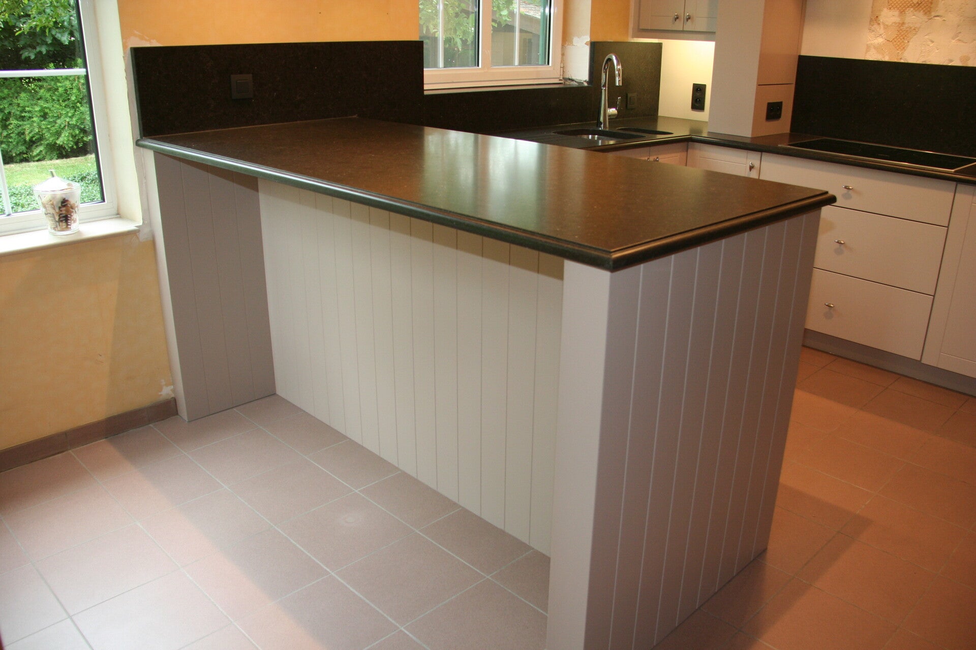 - Op de plaats waar de muur stond komt een groot eilandmeubel met ingewerkte spoelbak en kasten langs beide zijden.