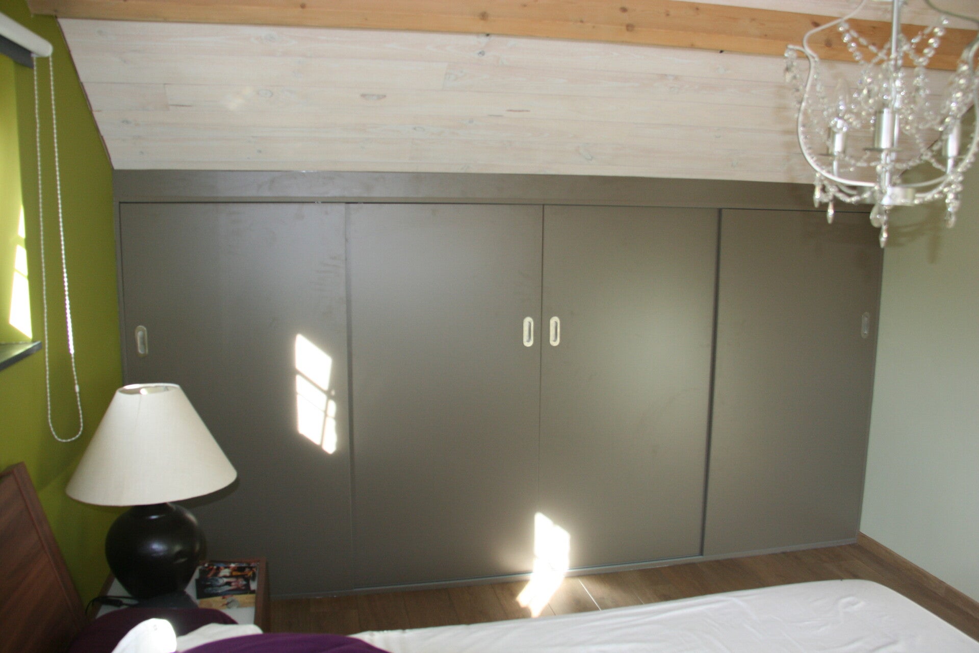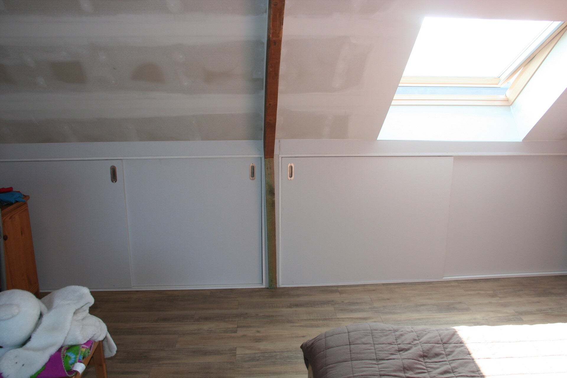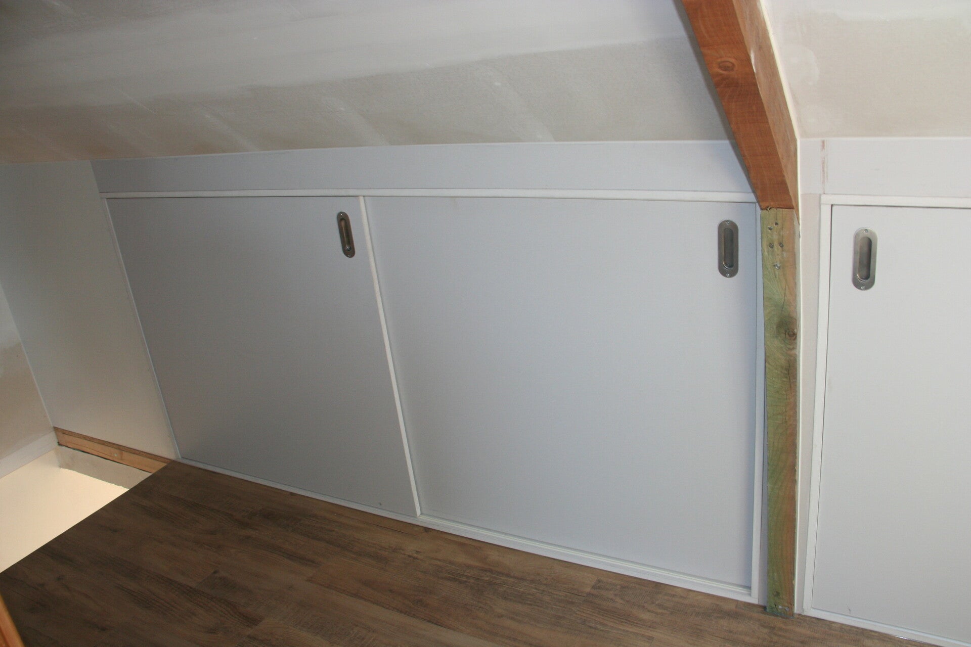 - Transformatie van een stockageruimte op de zolder naar een gezellige slaapkamer, maar met nog meer stockageruimte achter de schuifwanden. De wanden werden aan beide zijden in de kamer uitgevoerd.