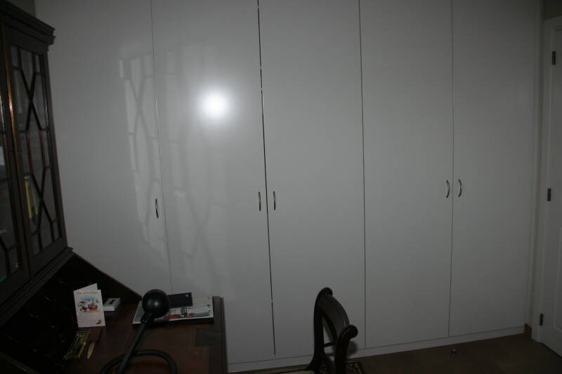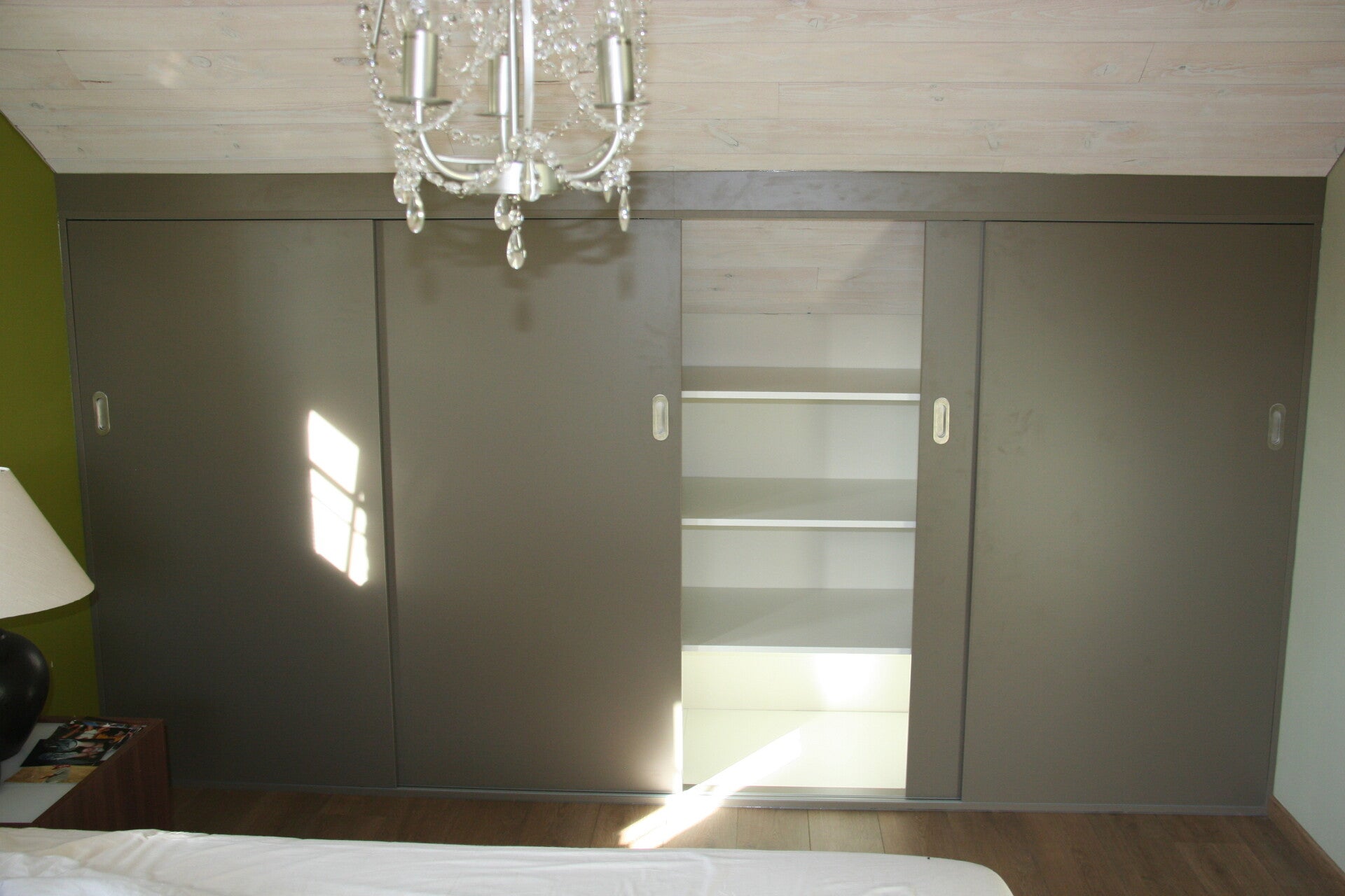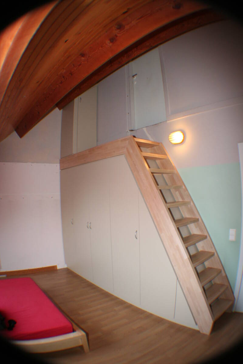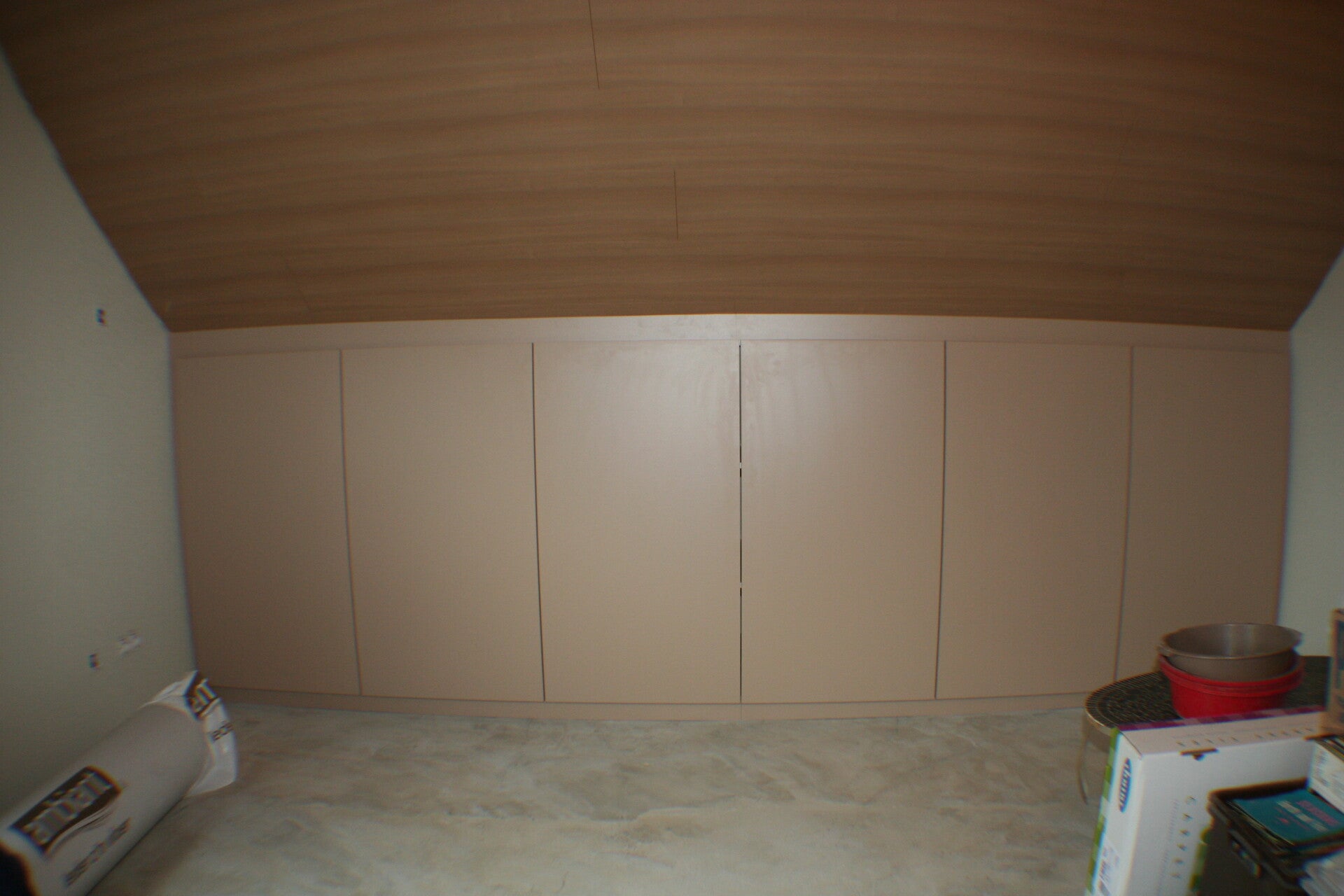 - Transformatie van een stockageruimte op de zolder naar een gezellige slaapkamer, maar met nog meer stockageruimte achter de schuifwanden. De wanden werden aan beide zijden in de kamer uitgevoerd.