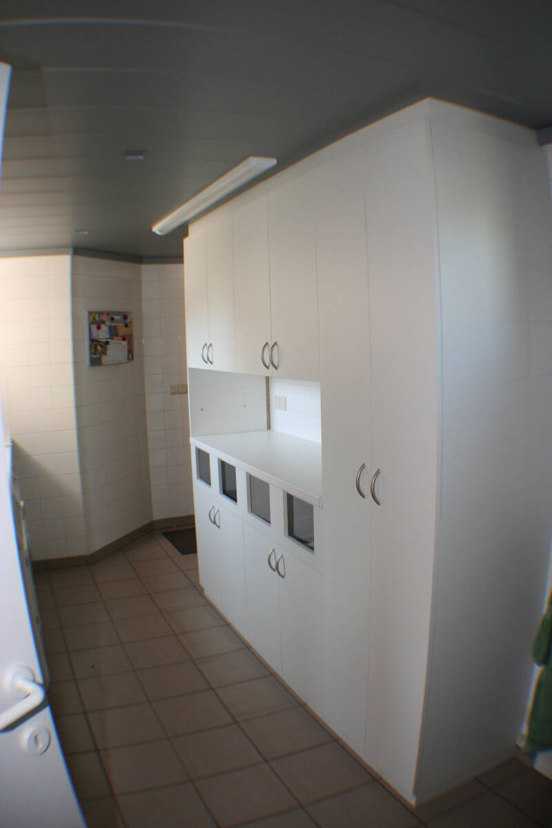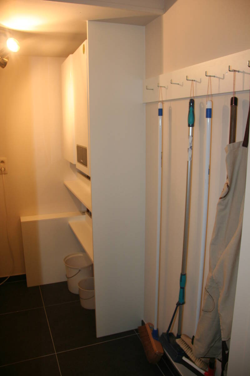 - Rechts de wandkast met sorteervakken voor waslinnen.