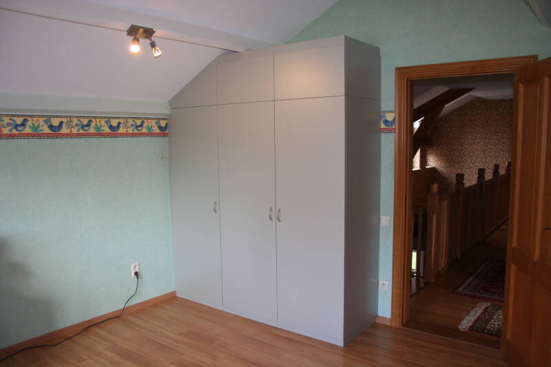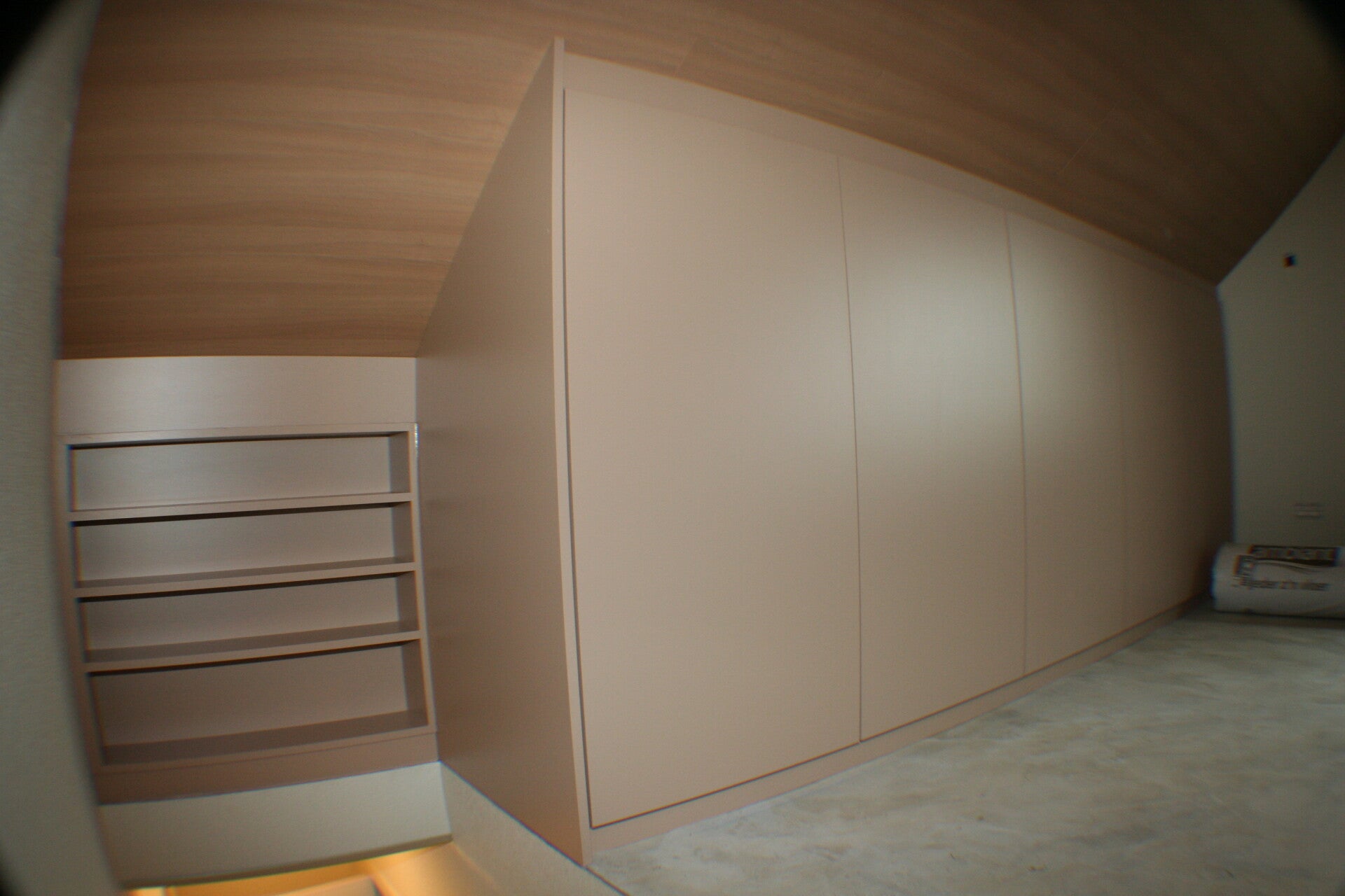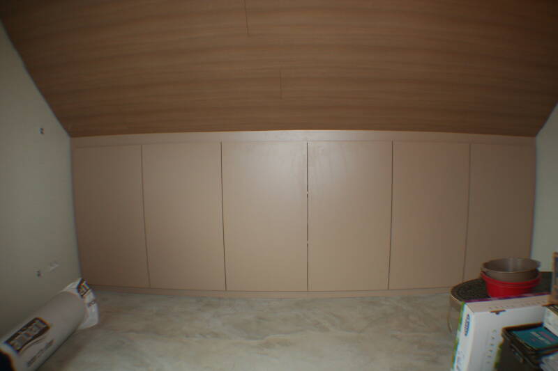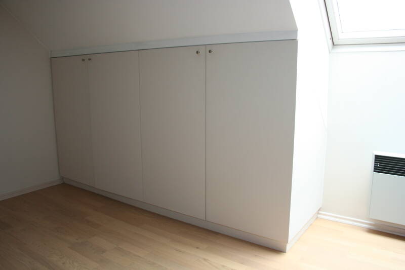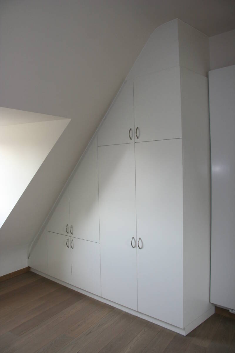- 2 zijden wandvullende kast onder schuine dakrand.