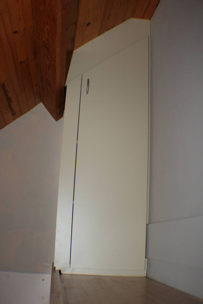 - De foto rechts toont een kast onder de schuine dakrand, met draaideuren